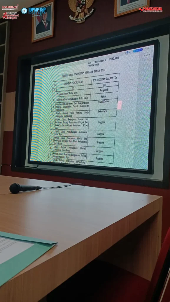 Analis Kebijakan Ahli Pratama DPMPTSP Kubu Raya, Ibu Dwi Lospasari Nurhamiyawati,S.S.T, mewakili Kepala Dinas PMPTSP Kubu Raya dalam menghadiri rapat sosialisasi surat keputusan Bupati tentang Tim Penertiban Reklame di Ruang Rapat Wakil Bupati Kubu Raya, Rabu 6 November 2024.