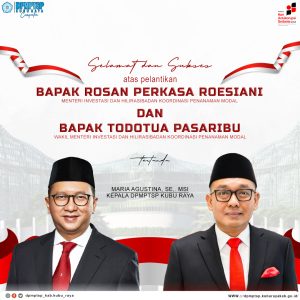 DPMPTSP Mengucapkan selamat dan sukses kepada Bapak rosanroeslani atas pelantikan sebagai Menteri Investasi dan Hilirisasi/Kepala BKPM serta Bapak todotua sebagai Wakil Menteri Investasi dan Hilirisasi/Wakil
