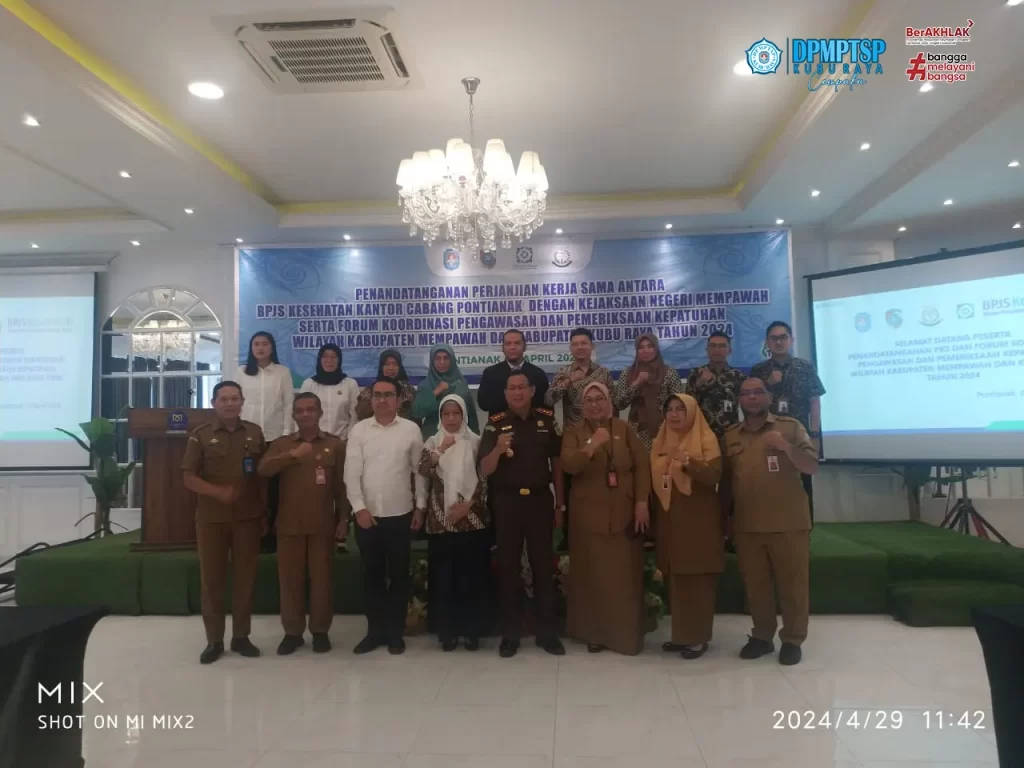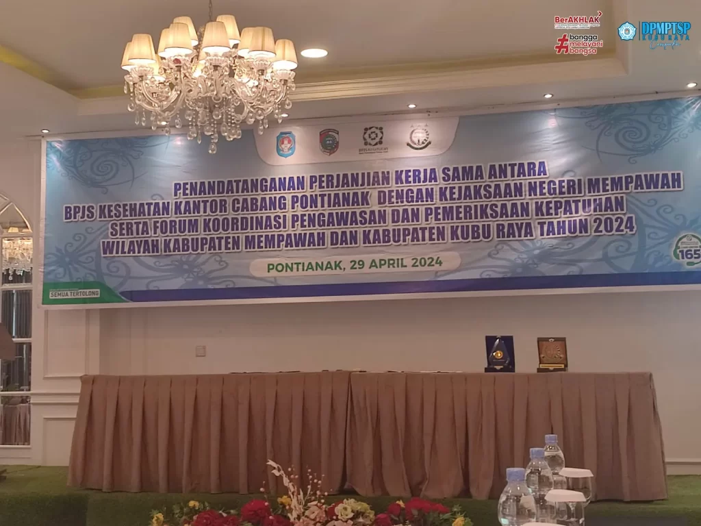 Kepala Dinas Penanaman Modal dan Pelayanan Terpadu Satu Pintu (DPMPTSP) Kabupaten Kubu Raya, Ibu Maria Agustina, SE, M.Si menghadiri kegiatan Penandatanganan Perjanjian Kerja Sama Antara BPJS Kesehatan Kantor Cabang Pontianak Dengan Kejaksaan Negeri Mempawah Serta Forum Koordinasi Pengawasan dan Pemeriksaan Kepatuhan Wilayah Kabupaten Mempawah dan Kabupaten Kubu Raya Tahun 2024. Kegiatan dilaksanakan pada hari Senin, 29 April 2024.