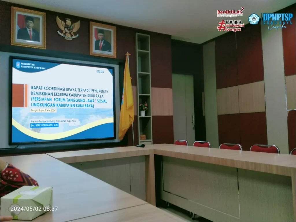 Penata Kelola Penanaman Modal Ahli Madya DPMPTSP Kubu Raya, Bapak Adi Mulyono, ST dan Bapak Herdi, S.ST, M.SOS menghadiri kegiatan Rapat Koordinasi Upaya Terpadu Penurunan Kemiskinan Ekstrem Kabupaten Kubu Raya ( Persiapan Forum Tanggung Jawab Sosial Lingkungan Kabupaten Kubu Raya ). Kegiatan diselenggarakan oleh BAPPEDA Kubu Raya pada hari Kamis, 2 Mei 2024 bertempat di Ruang Rapat Pamong Praja II.