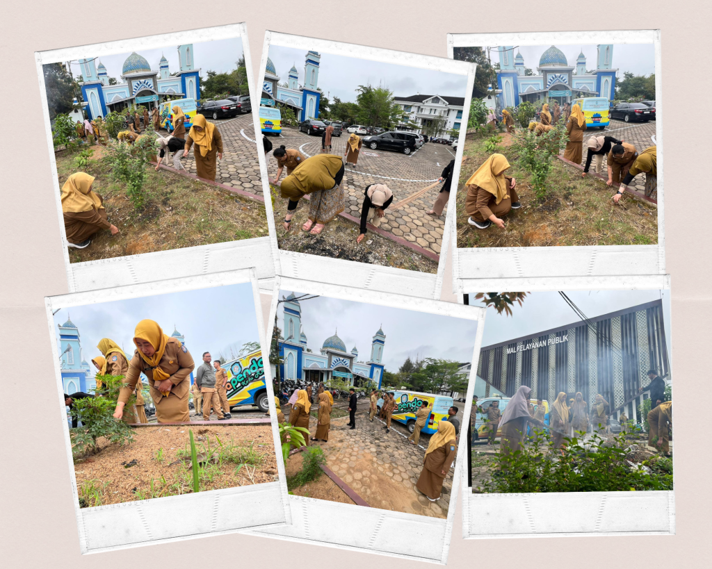 Aksi gotong royong tersebut meliputi pembersihan area taman, mencabut rumput liar, menyapu halaman dan area paving block lahan parkir, hingga membersihkan area di sekitar masjid yang berada dalam kompleks tersebut. Selain itu, para pegawai juga menata kembali tanaman dan membersihkan sisa-sisa daun kering agar lingkungan terlihat lebih rapi.